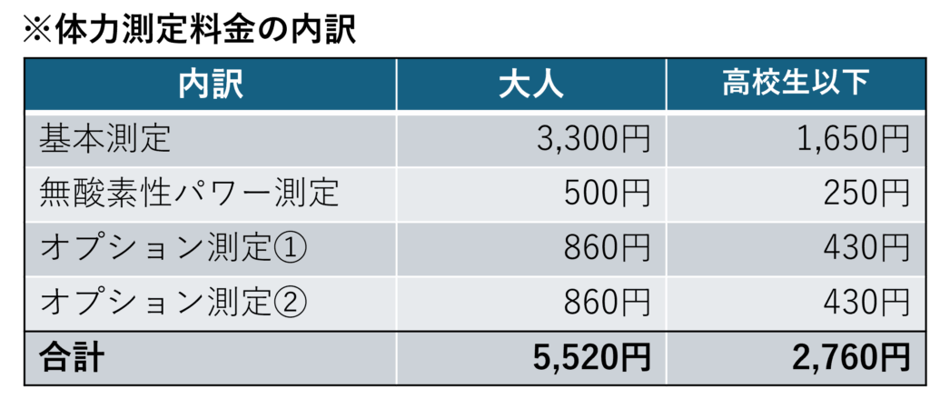 ①体力測定(大人5,520円/円、高校生以下:2,760円/人)+ウエイトトレーニング指導(大人1,440円/円、高校生以下:720円/人)+栄養指導(大人1,100円/人、高校生以下550円/人)
